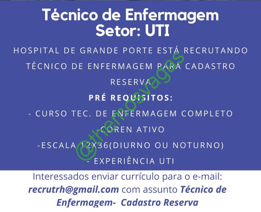 – Interessados(as) e que atendam ao perfil solicitado acima, devem enviar o currículo para o e-mail recrutrh@gmail.com , contendo no título/assunto “Técnico de Enfermagem – Cadastro Reserva“.