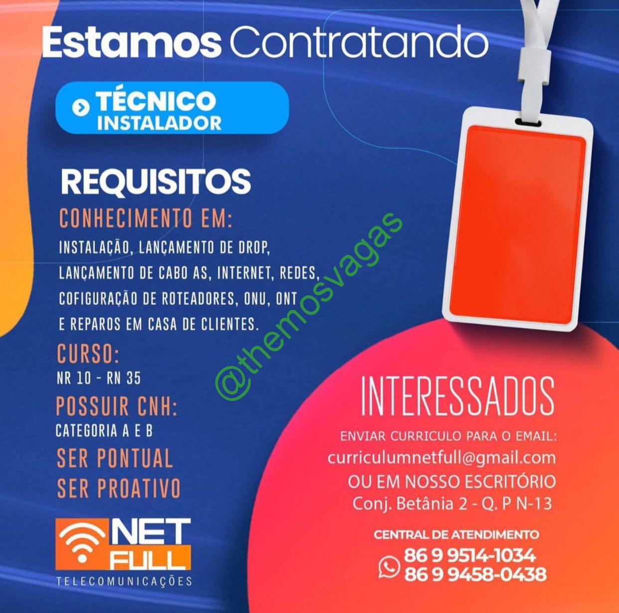 – Interessados(as) e que atendam ao perfil solicitado acima, devem enviar o currículo para o e-mail curriculumnetfull@gmail.com contendo no título/assunto “Técnico Instalador – PHB“ ou entregar no seguinte endereço: Conjunto Betânia 2 – Q P N-13, Parnaíba/PI.