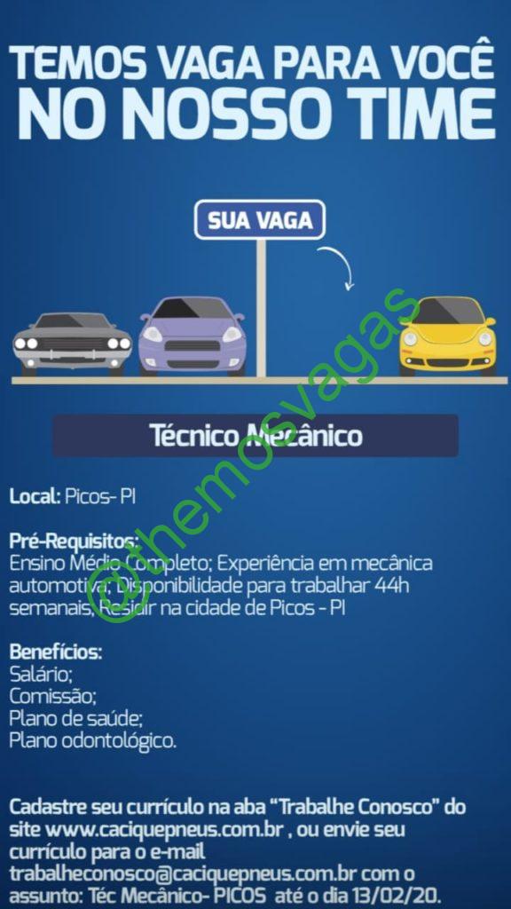 – Interessados(as) e que atendam ao perfil solicitado acima, devem enviar o currículo até 13/02/2020 para o e-mail trabalheconosco@caciquepneus.com.br contendo no título/assunto “Téc Mecânico – Picos” ou devem realizar o cadastro através do site www.caciquepneus.com.br .