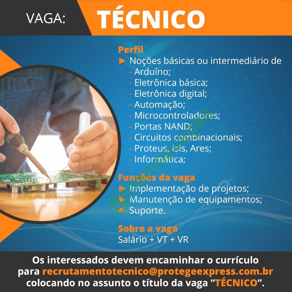 – Interessados(as) e que atendam ao perfil solicitado acima, devem enviar o currículo para o e-mail recrutamentotecnico@protegeexpress.com.br , colocando no título “Técnico”.