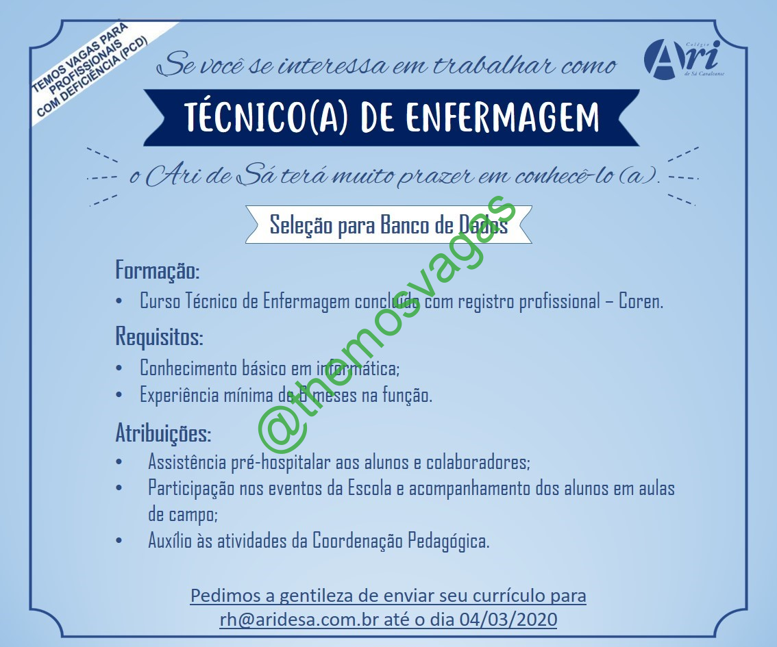 – Interessados(as) e que atendam ao perfil solicitado acima, devem até o dia 04/03/2020 enviar o currículo para o e-mail rh@aridesa.com.br , colocando no título “Técnico(a) de Enfermagem”.