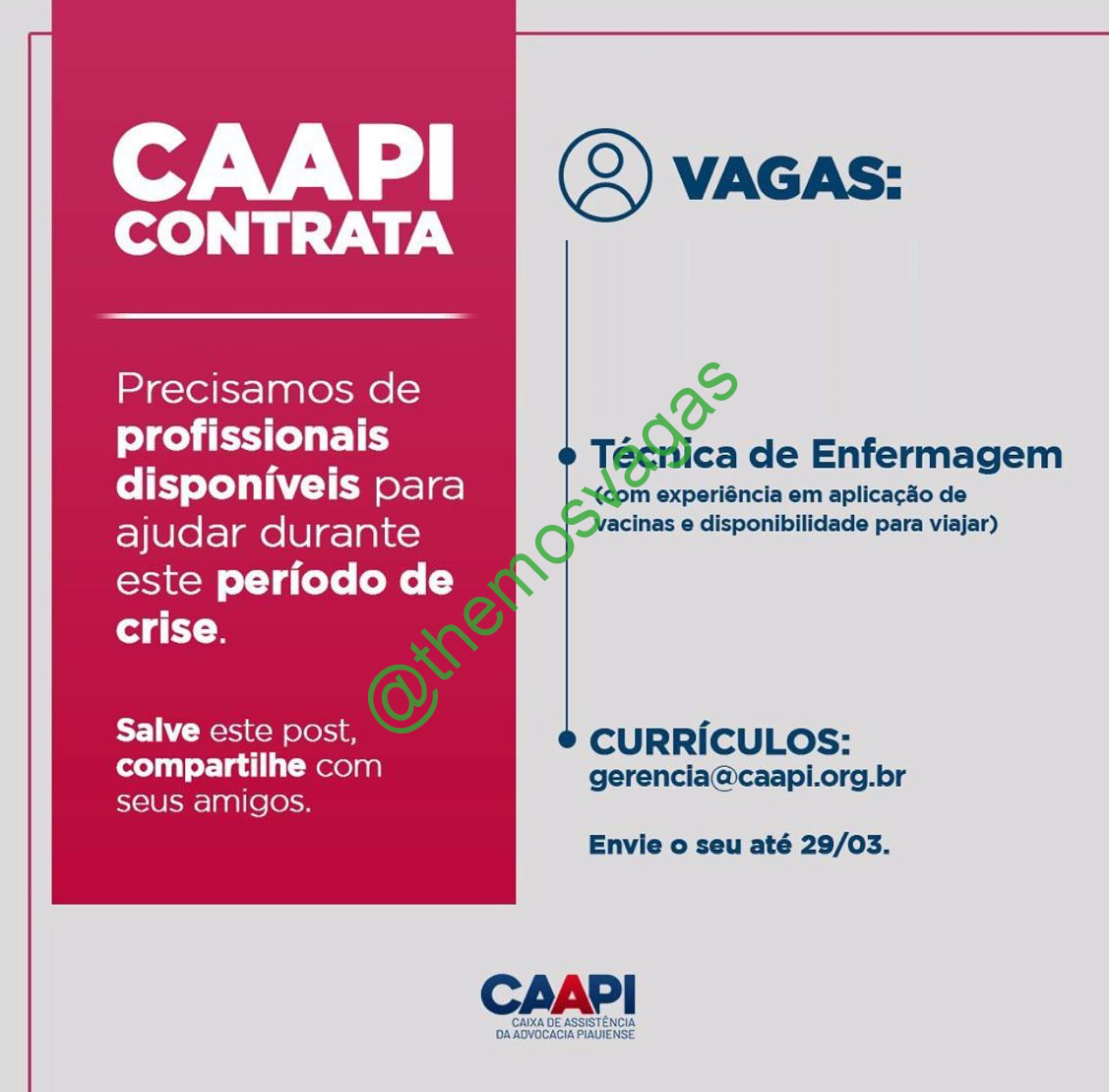 – Interessados(as) e que atendam ao perfil solicitado acima, devem enviar o currículo até o dia 29/03/2020 para o e-mail gerencia@caapi.org.br , colocando no título/assunto: “Técnico(a) em Enfermagem THE”.