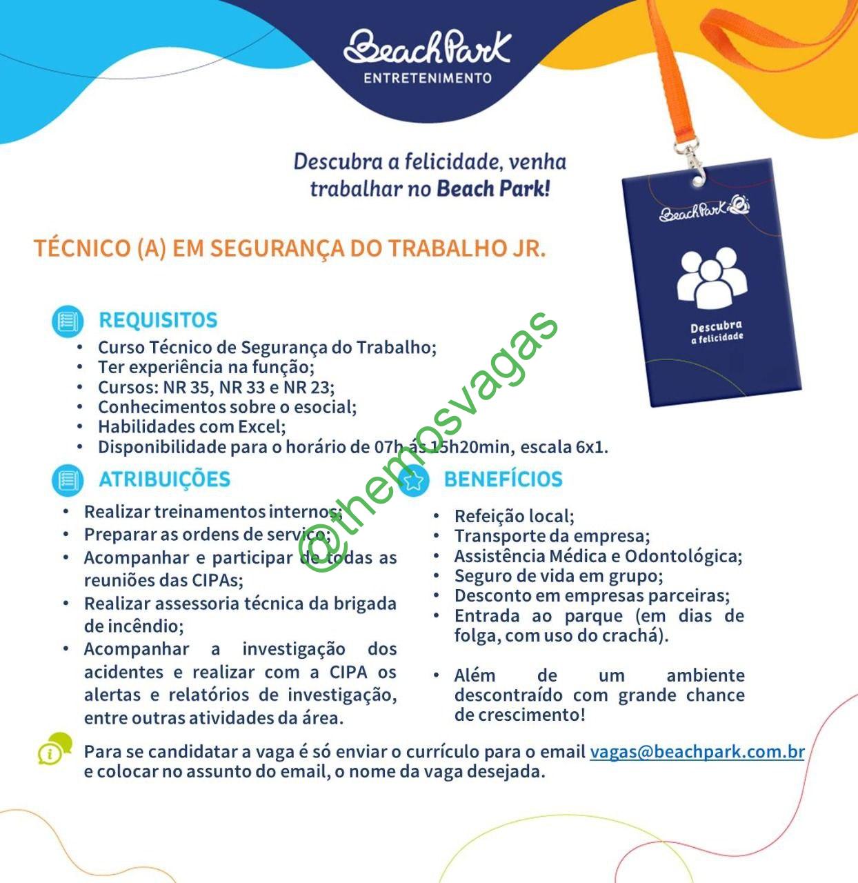 – Interessados(as) e que atendam ao perfil solicitado acima, devem enviar o currículo para o e-mail vagas@beachpark.com.br, contendo no titulo/assunto “Técnico(a) em Segurança do Trabalho – FOR”