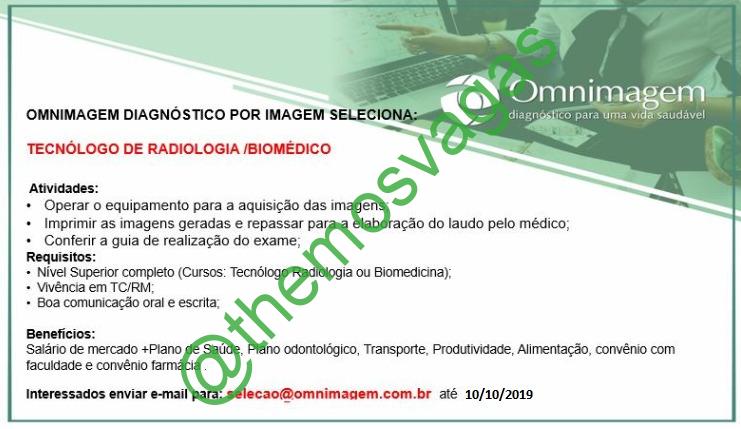 – Interessados(as) e que atendam ao perfil solicitado acima, devem enviar o currículo para o e-mail selecao@omnimagem.com.br  até o dia 10/10/2019, colocando no título “Tecnólogo de Radiologia”.