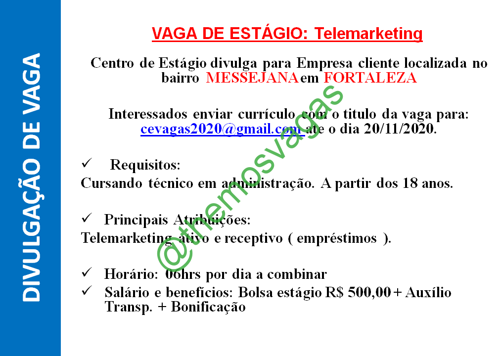 – Interessados(as) e que atendam ao perfil solicitado acima, devem enviar o currículo com pretensão salarial para o e-mail etelmadeira.rh@gmail.com , contendo no título/assunto “Telemarketing – FOR“.
