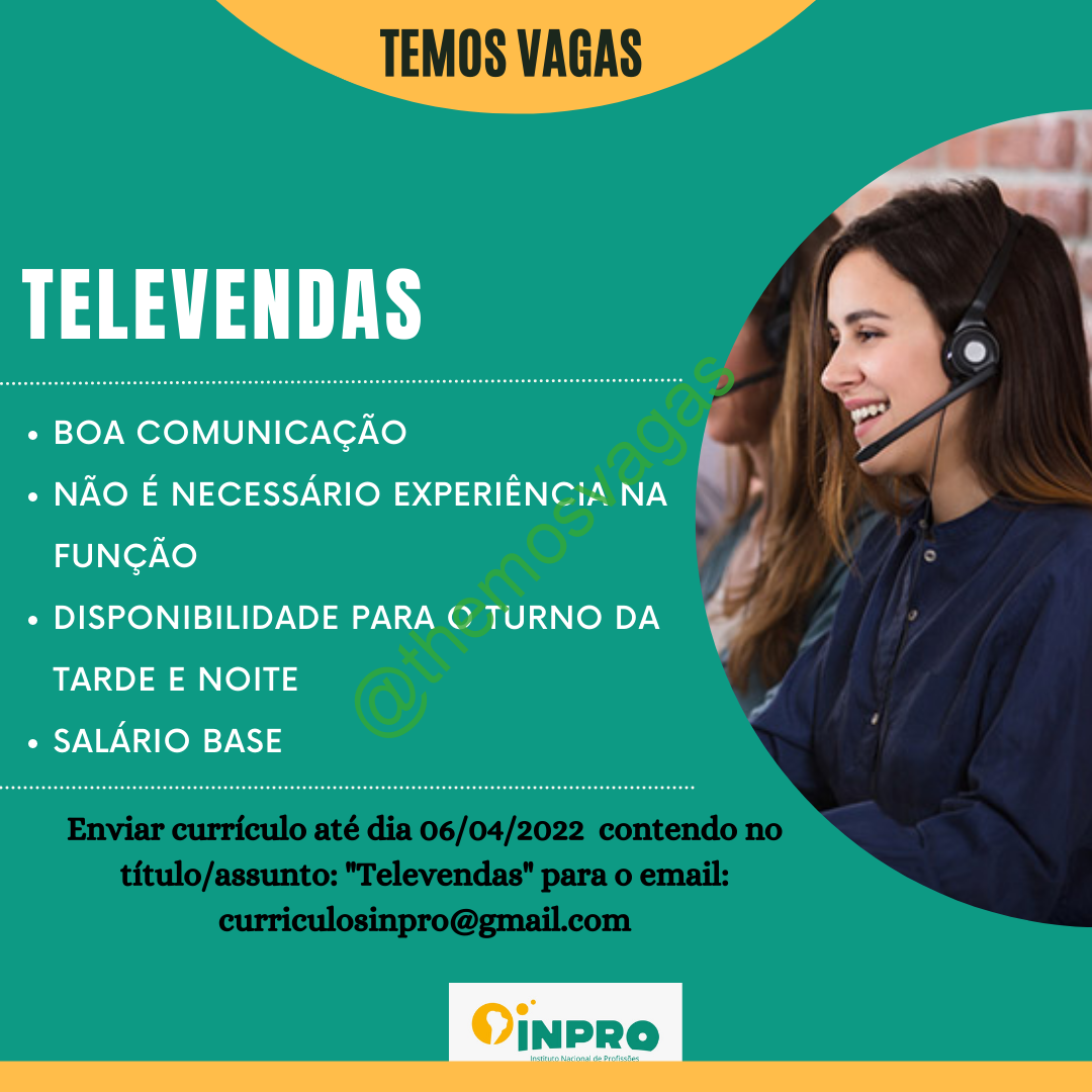 – Interessados(as) e que atendam ao perfil solicitado acima, devem enviar o currículo até 06/04/2022  para o e-mail curriculosinpro@gmail.com contendo no título/assunto “Televendas