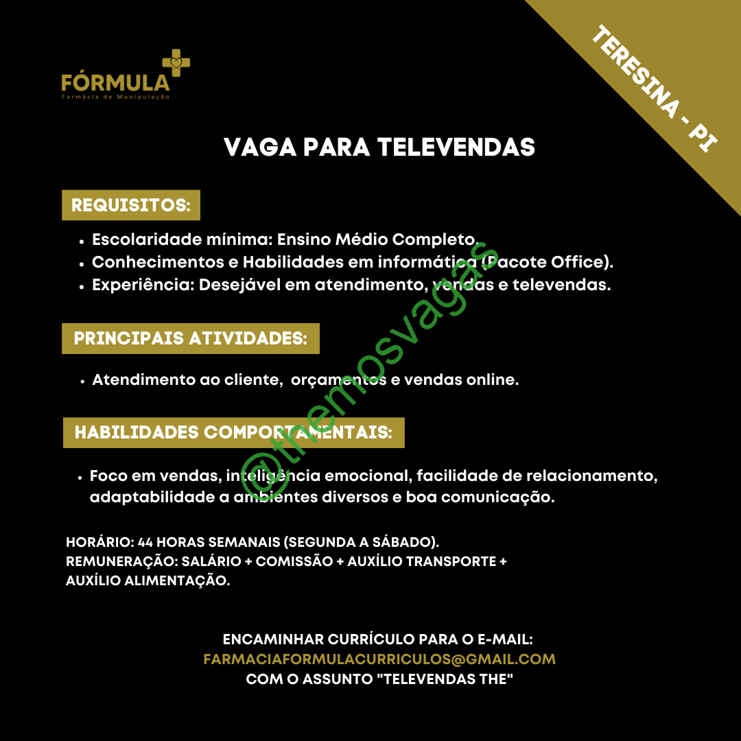 – Interessados(as) e que atendam ao perfil solicitado acima, devem enviar o currículo para o e-mail farmaciaformulacurriculos@gmail.com contendo no título/assunto “Televendas THE