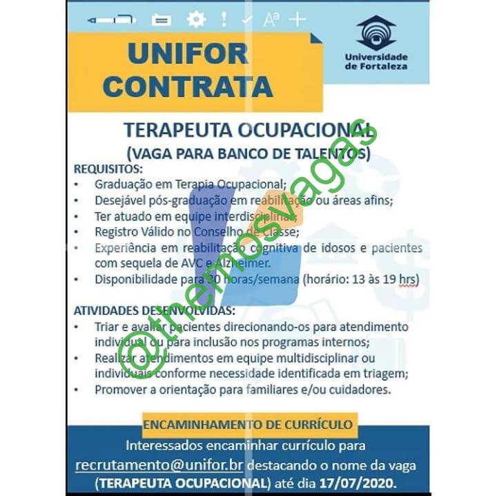 – Interessados(as) e que atendam ao perfil solicitado acima, devem até o dia 17/07/2020 enviar o currículo para o e-mail recrutamento@unifor.br , colocando no título “Terapeuta Ocupacional”.