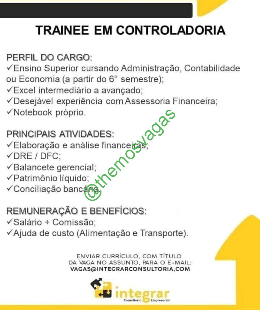 – Interessados(as) e que atendam ao perfil solicitado acima, devem  enviar o currículo para e-mail vagas@integrarconsultoria.com, contendo no titulo/assunto “Trainee em Controladoria – FOR”.