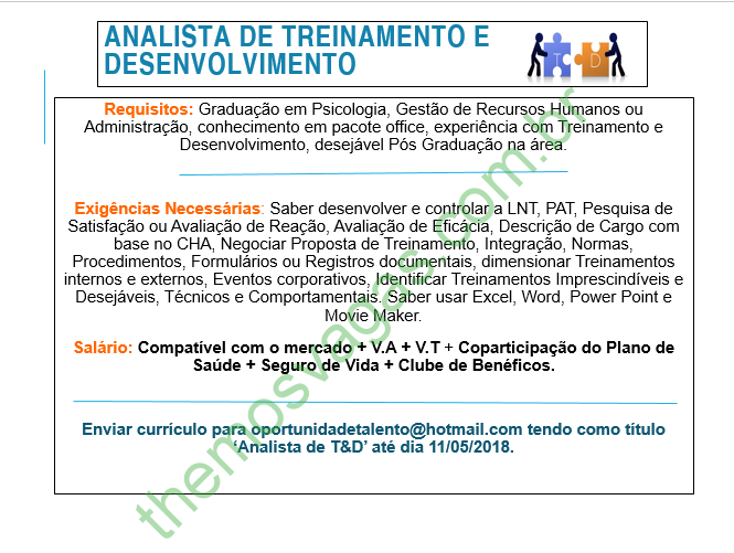 Interessados(as) e que atendam aos requisitos devem enviar o perfil profissional até o dia 11/05/2018, colocando no título do e-mail “Analista TeD”,para: oportunidadetalento@hotmail.com