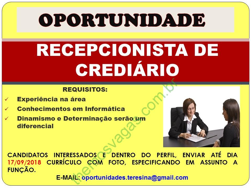 Interessados(as) e que atendam aos requisitos devem enviar o perfil profissional até o dia 1709/2018, colocando no título do e-mail “Recepcionista de crediário”, para: oportunidaes.teresina@gmail.com