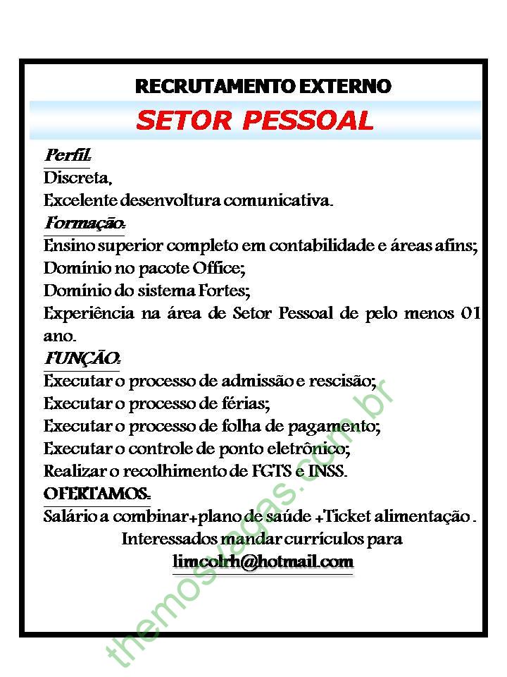 Interessados(as) e que atendam aos requisitos devem enviar o perfil profissional para o e-mail: limcolrh@hotmail.com