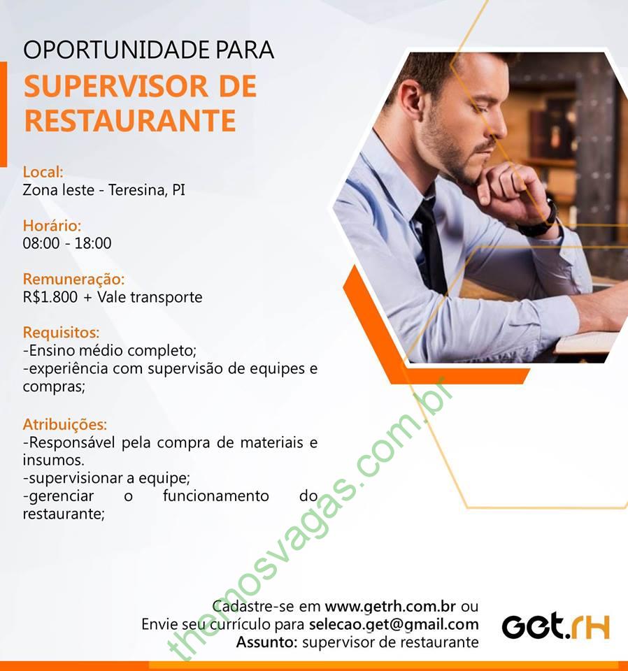 Interessados(as) e que atendam aos requisitos devem enviar o perfil profissional, colocando no título do e-mail “supervisor de restaurante”, para: selecao.get@gmail.com