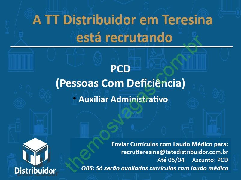 Interessados(as) e que atendam aos requisitos devem enviar o perfil profissional até o dia 05/04/2019, colocando no título do e-mail “PCD”, para: recrutteresina@tetedistribuidor.com.br