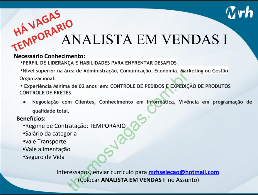 Interessados(as) e que atendam aos requisitos devem enviar o perfil profissional, colocando no título do e-mail “Analista de Vendas “, para: mrhselcao@hotmail.com