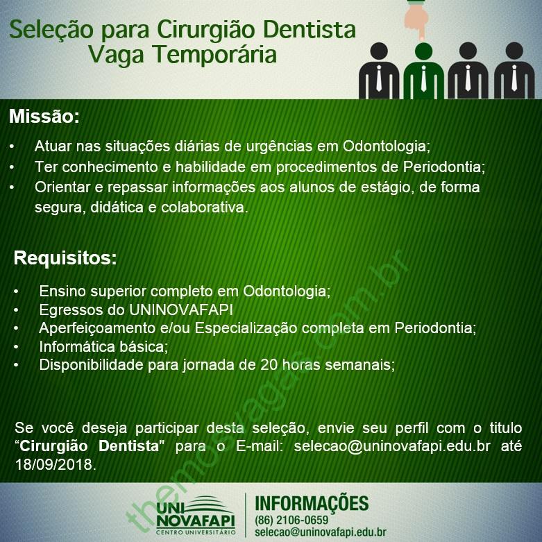 Interessados(as) e que atendam aos requisitos exigidos devem enviar o perfil profissional até 18/09/2018 contendo no título/assunto do e-mail “Cirurgião Dentista” para selecao@uninovafapi.edu.br .