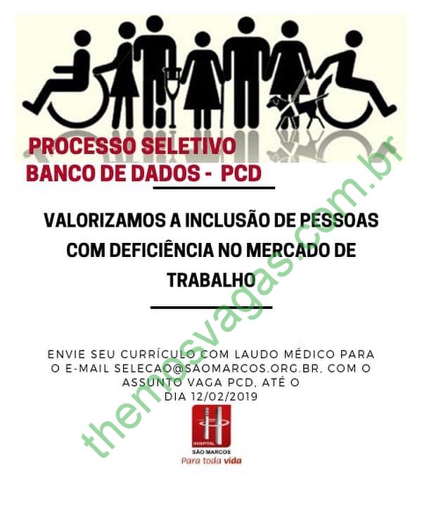 Interessados(as) e que atendam aos requisitos devem enviar o perfil profissional até o dia 12/02/2019, colocando no título do e-mail “Vaga PCD”, para: selecao@saomarcos.org.br