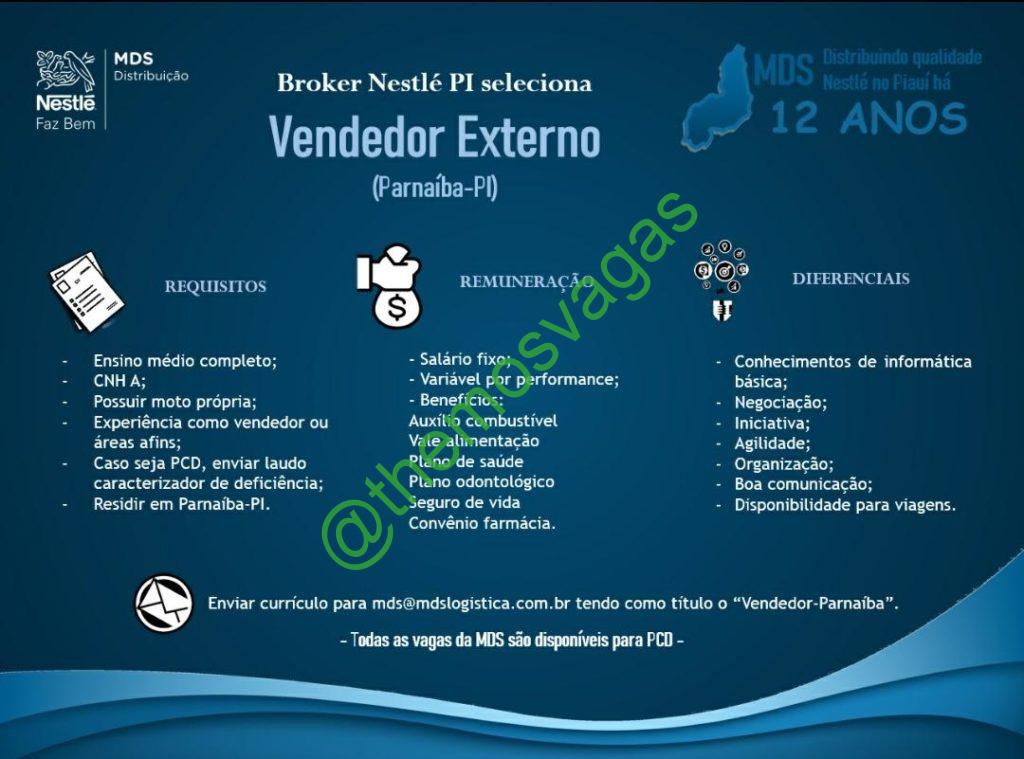 – Interessados(as) e que atendam ao perfil solicitado acima, devem enviar o currículo para o e-mail mds@mdslogistica.com.br , colocando no título/assunto: “Vendedor – Parnaíba”.