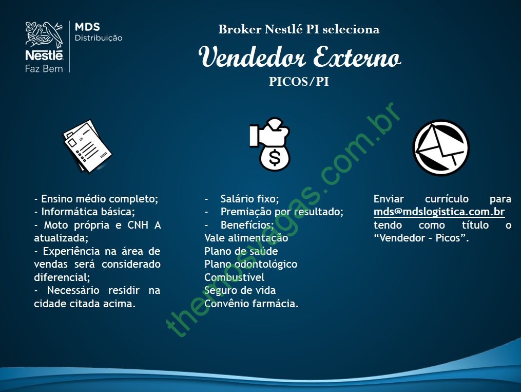 Interessados(as) e que atendam aos requisitos devem enviar o perfil profissional, colocando no título do e-mail “Vendedor Picos”, para: mds@mdslogistica.com.br