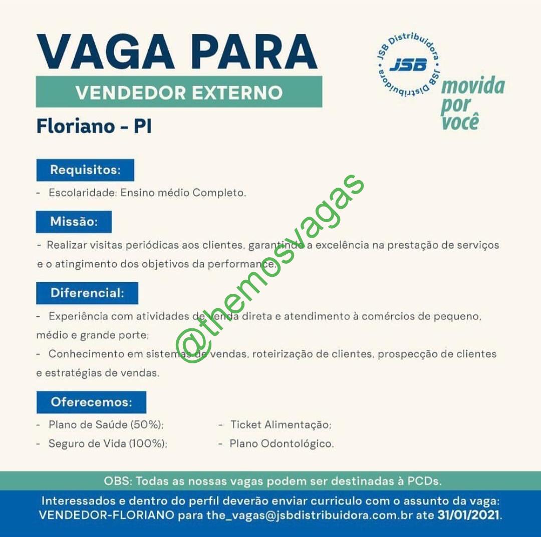 – Interessados(as) e que atendam ao perfil solicitado acima, devem enviar o currículo até 31/01/2021 para o e-mail the_vagas@jsbdistribuidora.com.br contendo no título/assunto “Vendedor – Floriano
