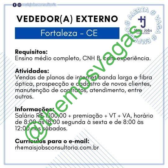 – Interessados(as) e que atendam ao perfil solicitado acima, devem enviar o currículo para o e-mail rh@maisjobsconsultoria.com.br, contendo no título/assunto “Vendedor Externo FOR“.