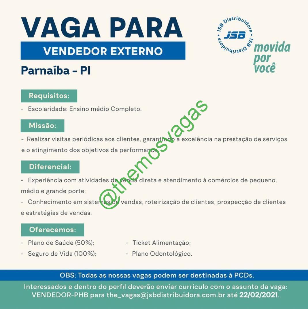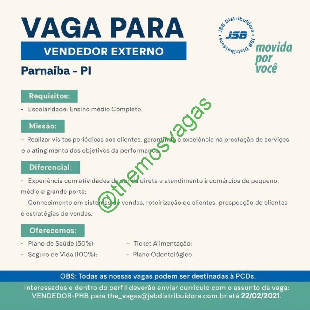 – Interessados(as) e que atendam ao perfil solicitado acima, devem enviar o currículo até 22/02/2021 para o e-mail the_vagas@jsbdistribuidora.com.br contendo no título/assunto “Vendedor Externo PHB