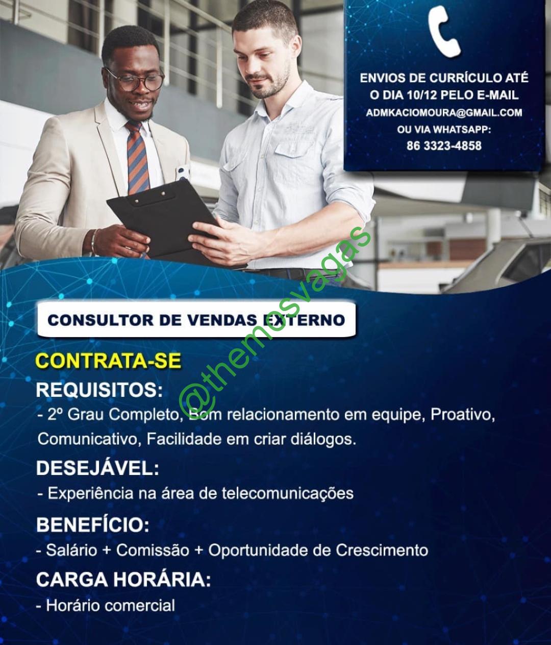 – Interessados(as) e que atendam ao perfil solicitado acima, devem enviar o currículo até 10/12/2021 para o e-mail admkaciomoura@gmail.com contendo no título/assunto “Consultor de Vendas Externo – PHB“ ou através do telefone/whats (86) 3323-4858.
