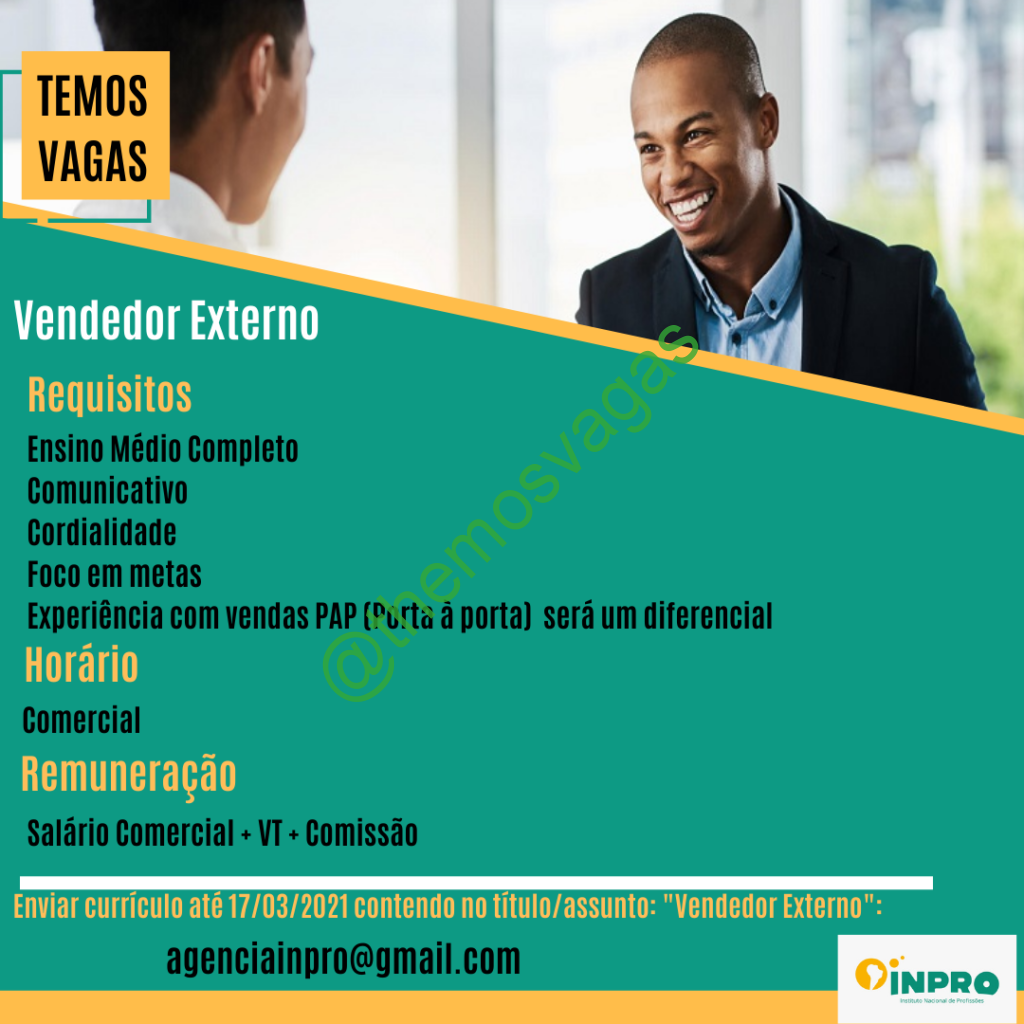 – Interessados(as) e que atendam ao perfil solicitado acima, devem enviar o currículo até 17/03/2021 para o e-mail agenciainpro@gmail.com contendo no título/assunto “Vendedor Externo THE