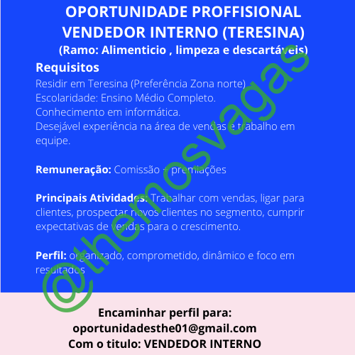 – Interessados(as) e que atendam ao perfil solicitado acima, devem enviar o currículo até o 11/01/2020 para o e-mail oportunidadesthe01@gmail.com contendo no título/assunto “Vendedor Interno