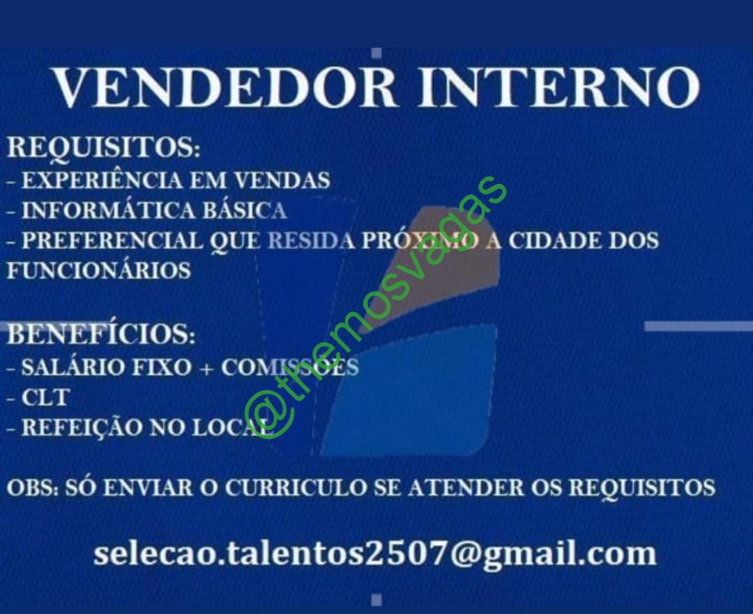 – Interessados(as) e que atendam ao perfil solicitado acima, devem enviar o currículo para o e-mail selecao.talentos2507@gmail.com, contendo no título/assunto “Vendedor Interno – FOR”.