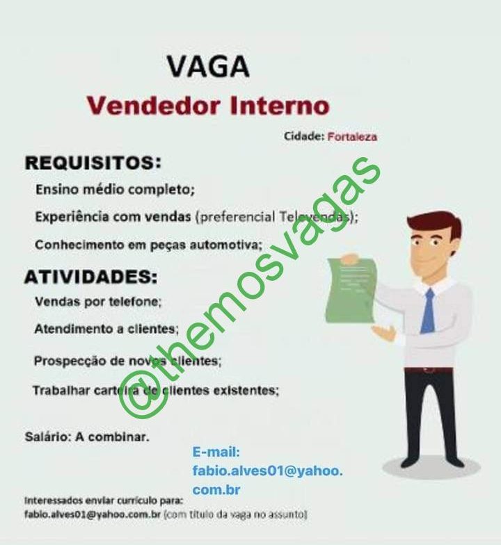 – Interessados(as) e que atendam ao perfil solicitado acima, devem enviar o currículo para o e-mail fabio.alves01@yahoo.com.br, contendo no título/assunto “Vendedor Interno – FOR