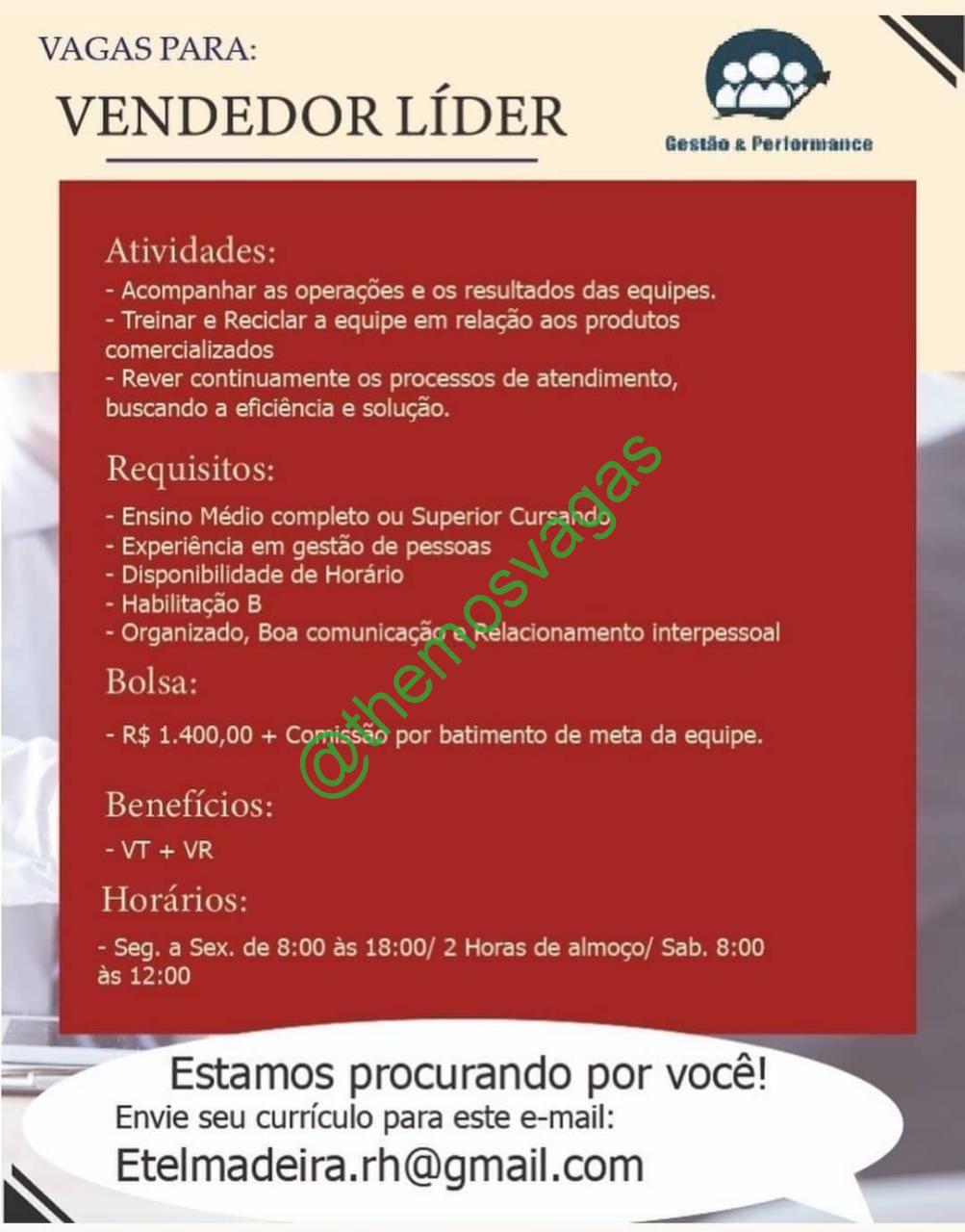– Interessados(as) e que atendam ao perfil solicitado acima, devem enviar o currículo para o e-mail etelmadeira.rh@gmail.com, contendo no titulo/assunto “Vendedor Líder – FOR