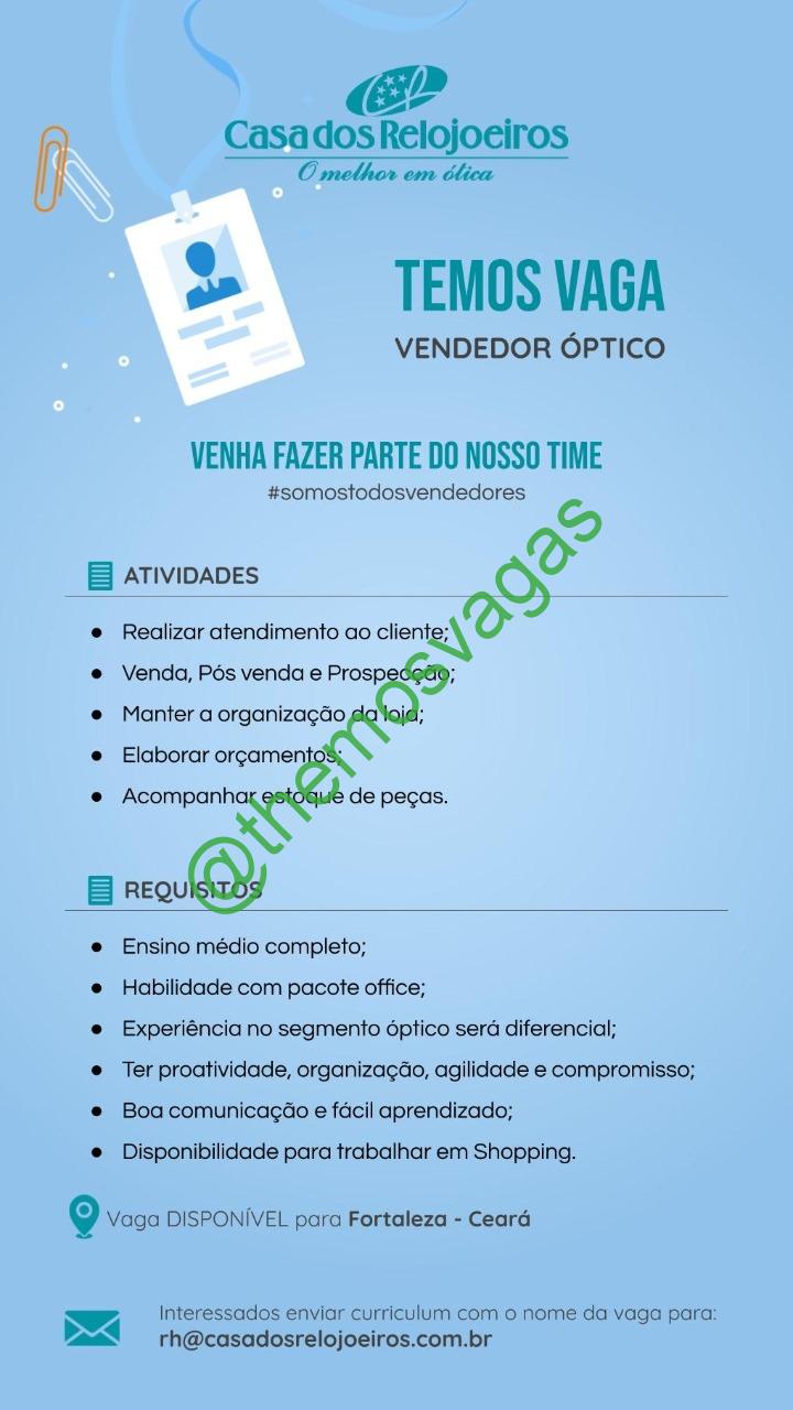 – Interessados(as) e que atendam ao perfil solicitado acima, devem enviar o currículo para o e-mail rh@casadosrelojoeiros.com.br, contendo no título/assunto “Vendedor Óptico – FOR”.