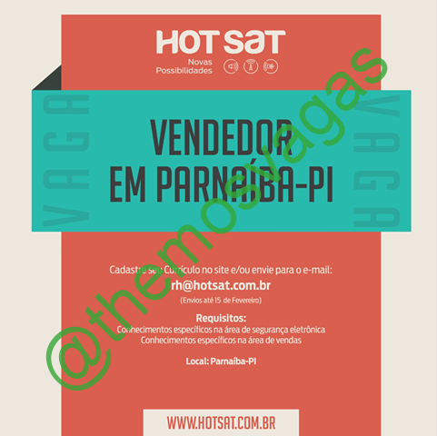 – Interessados(as) e que atendam ao perfil solicitado acima, devem enviar o currículo até 15/02/2021 para o e-mail rh@hotsat.com.br contendo no título/assunto “Vendedor PHB