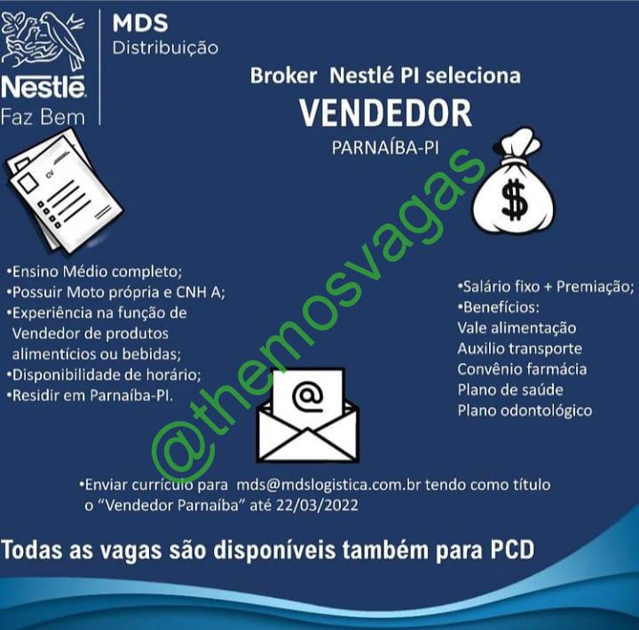 – Interessados(as) e que atendam ao perfil solicitado acima, devem enviar o currículo até 22/03/2022 para o e-mail mds@mdslogistica.com.br, contendo no título/assunto “Vendedor Parnaíba“.