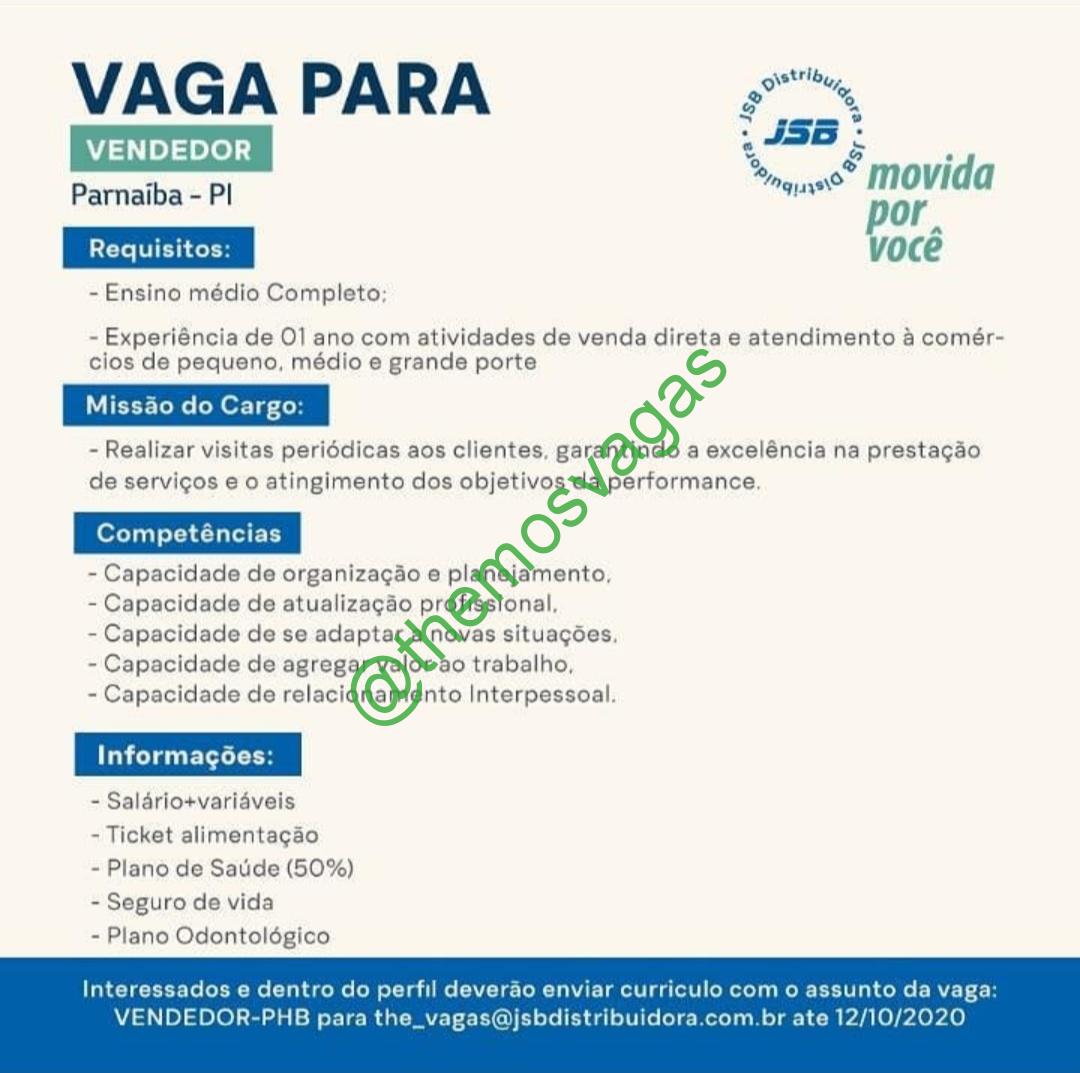 – Interessados(as) e que atendam ao perfil solicitado acima, devem enviar o currículo até 12/10/2020 para o e-mail the_vagas@jsbdistribuidora.com.br contendo no título/assunto “Vendedor – PHB
