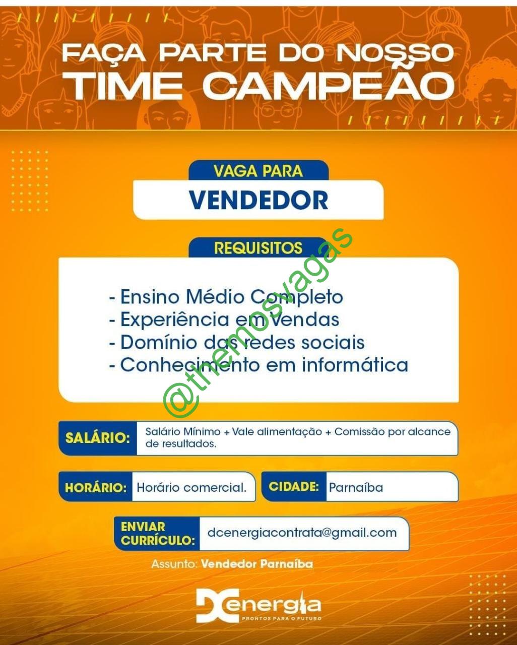 – Interessados(as) e que atendam ao perfil solicitado acima, devem enviar o currículo para o e-mail dcenergiacontrata@gmail.com contendo no título/assunto “Vendedor Parnaíba“.