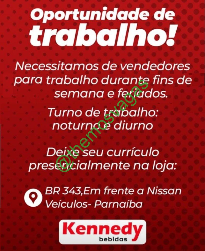 – Interessados(as) e que atendam ao perfil solicitado acima, devem entregar o currículo no seguinte endereço: BR 343, em frente a Nissan Veículos – Parnaíba/PI – Kennedy Bebidas.