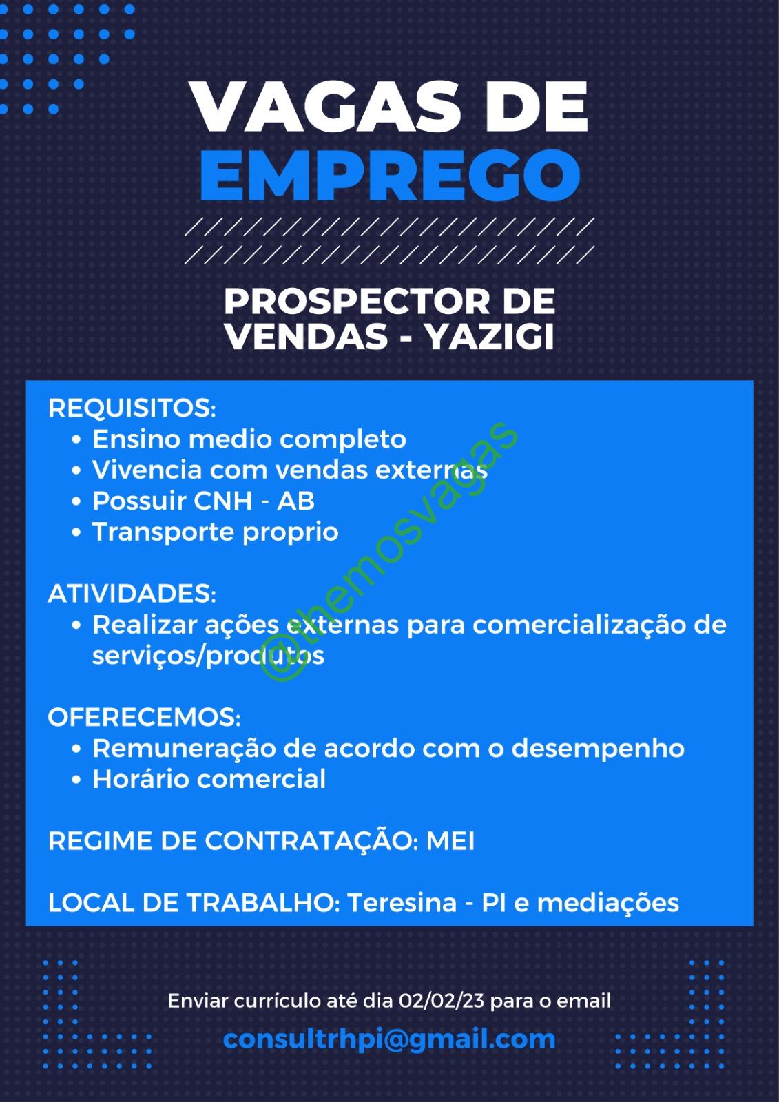 – Interessados(as) e que atendam ao perfil solicitado acima, devem enviar o currículo até 02/02/2023 para o e-mail consultrhpi@gmail.com contendo no título/assunto “Prospector de Vendas – THE