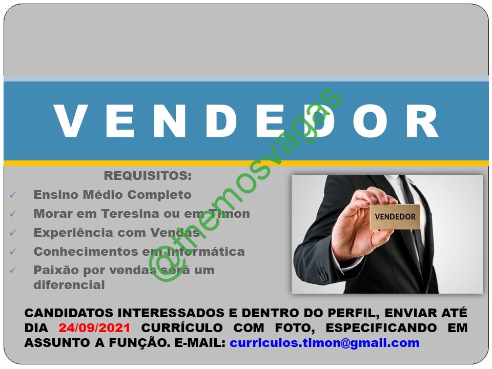 – Interessados(as) e que atendam ao perfil solicitado acima, devem enviar o currículo até 24/09/2021 para o e-mail curriculos.timon@gmail.com, contendo no título/assunto “Vendedor – Timon“.
