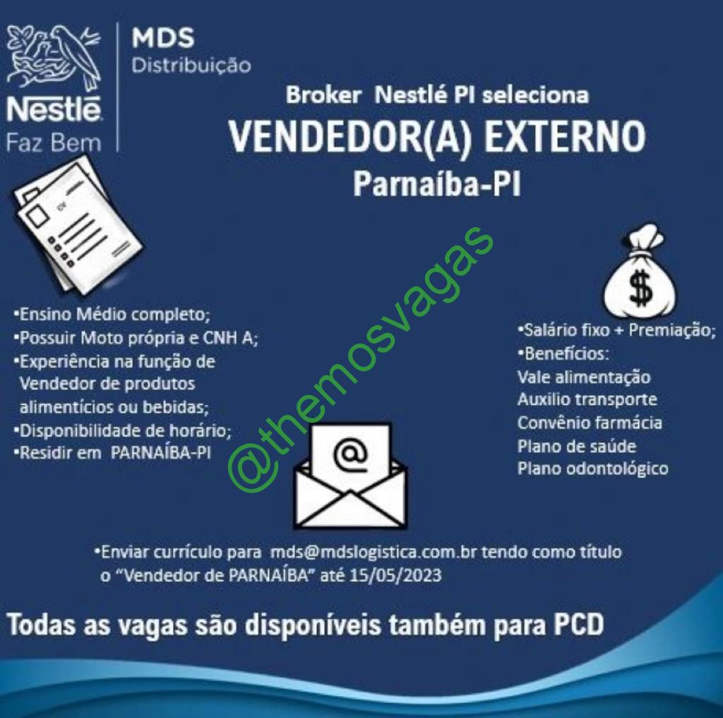– Interessados(as) e que atendam ao perfil solicitado acima, devem enviar o currículo até 15/05/2023 para o e-mail mds@mdslogistica.com.br contendo no título/assunto “Vendedor de Parnaíba”.
