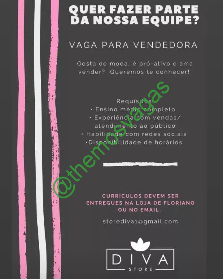 – Interessados(as) e que atendam ao perfil solicitado acima, devem enviar o currículo para o e-mail storediva1@gmail.com, contendo no título/assunto “Vendedor(a) – Floriano“.