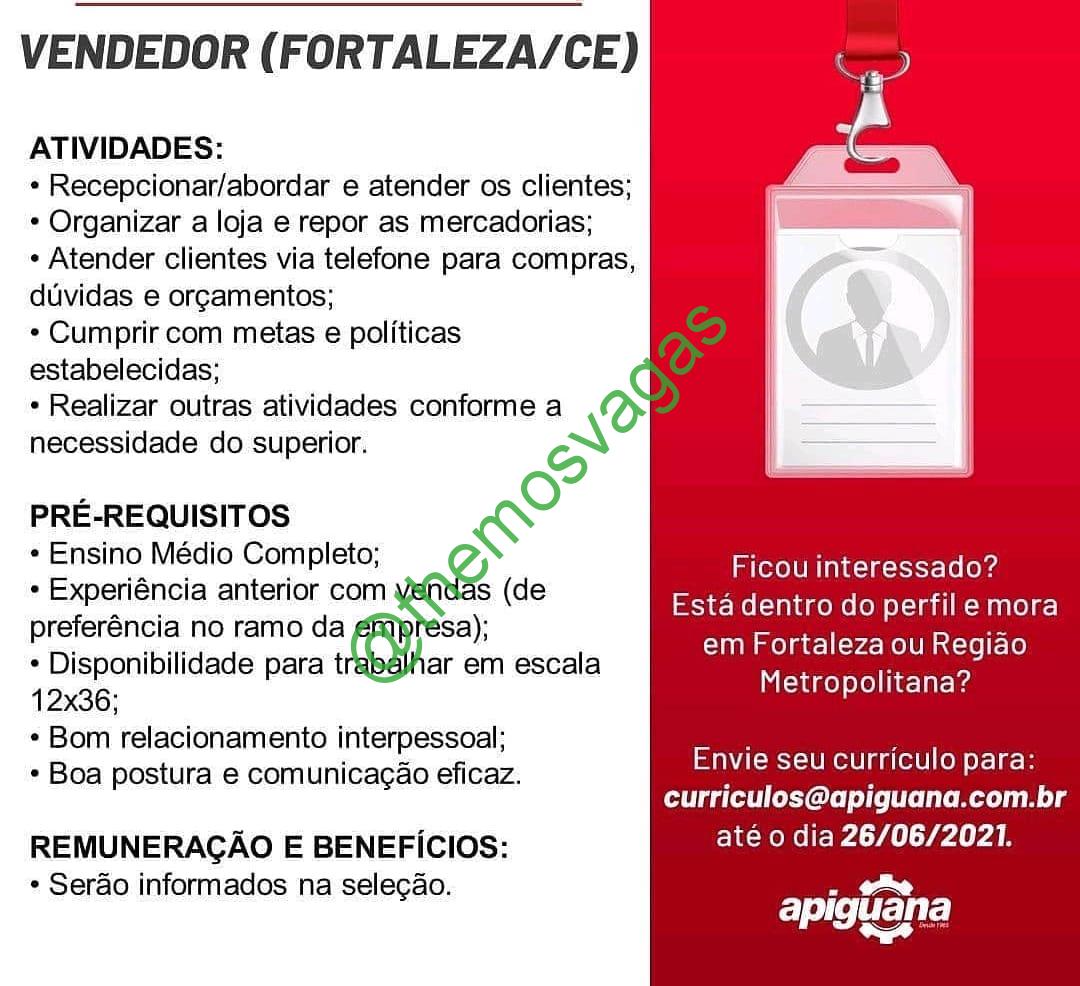 – Interessados(as) e que atendam ao perfil solicitado acima, devem enviar o currículo até 26|06|2021 para o e-mail curriculos@apiguana.com.br, contendo no titulo/assunto “Vendedor(a) – FOR