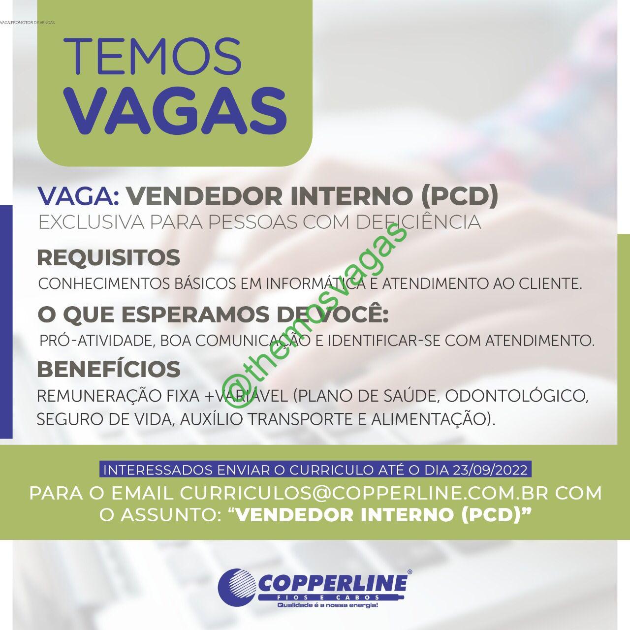 – Interessados(as) e que atendam ao perfil solicitado acima, devem enviar o currículo até 23/09/2022 para o e-mail curriculos@copperline.com.br contendo no título/assunto “Vendedor Interno (PCD)