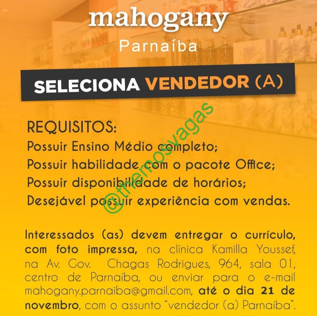 – Interessados(as) e que atendam ao perfil solicitado acima, devem enviar o currículo até 21/11/2020 para o e-mail mahogany.parnaiba@gmail.com contendo no título/assunto “Vendedor(a) Parnaíba