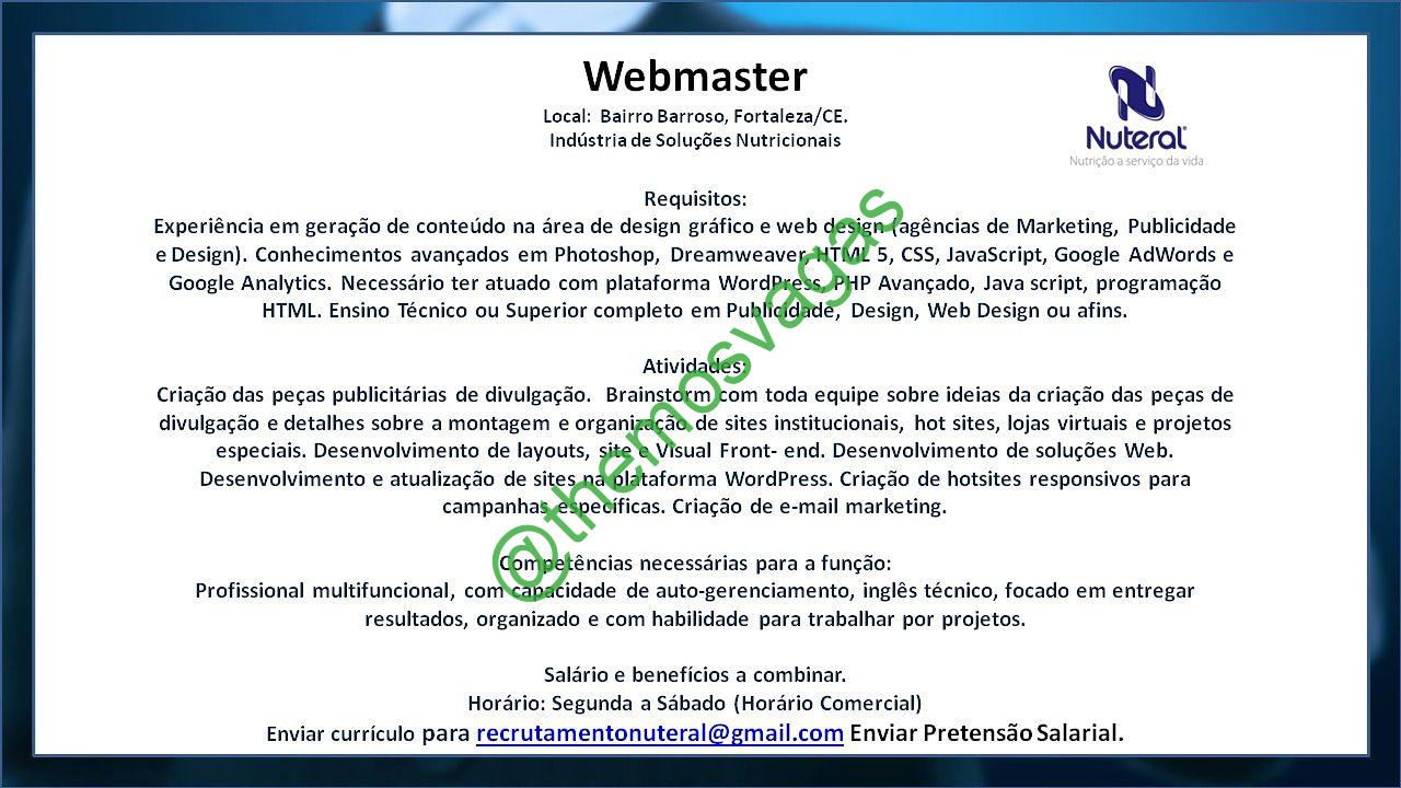 – Interessados(as) e que atendam ao perfil solicitado acima, devem enviar o currículo e pretensão salarial para o e-mail recrutamentonuteral@gmail.com , colocando no título “Webmaster”.